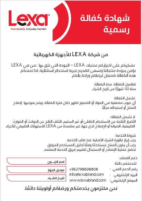نشكركم على اختياركم منتجات LEXA - الجودة التي تثق بها ، نحن في LEXA نؤمن بجودة منتجاتنا ونسعى لتقديم تجربة استخدام استثنائية، لذا نمتحكم
